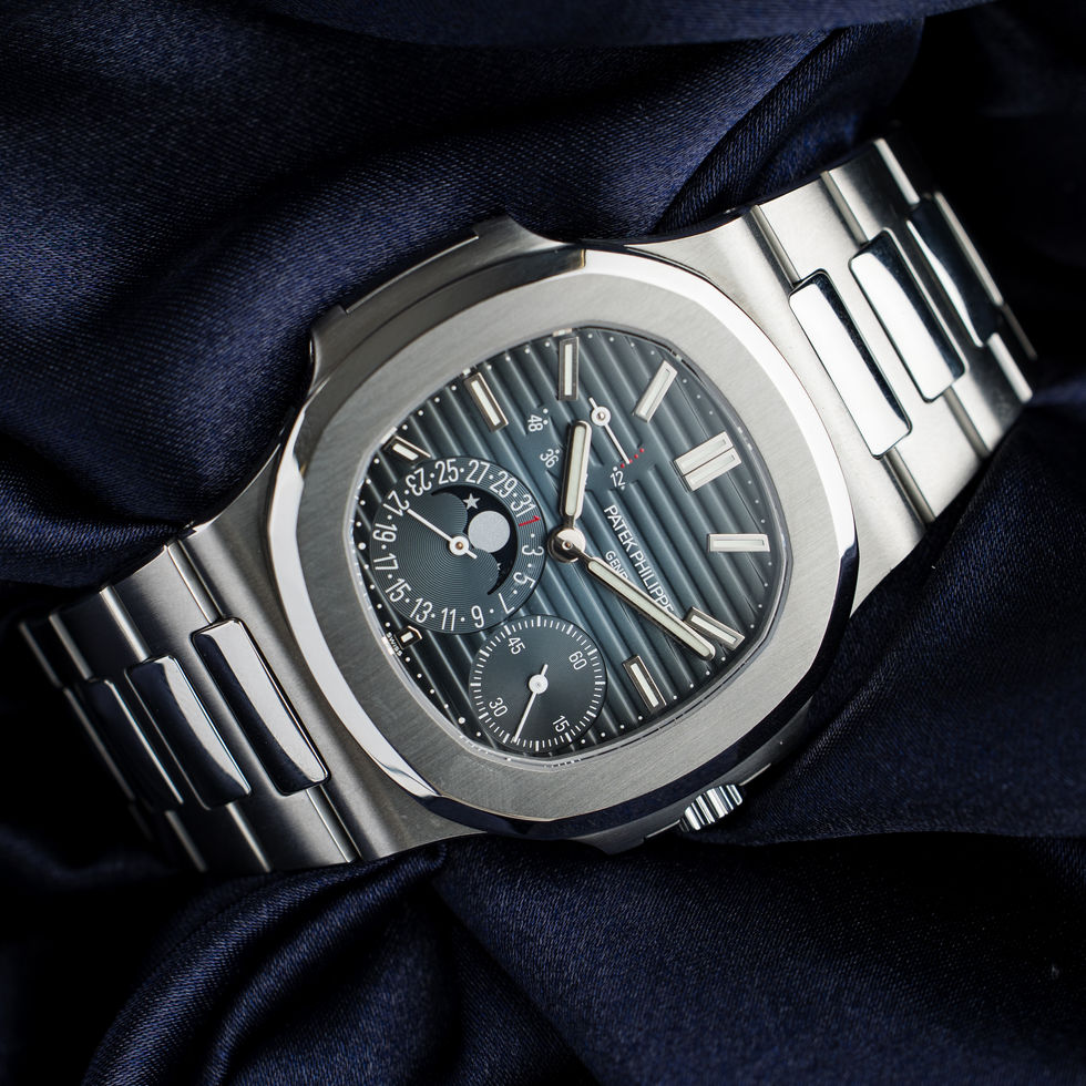 Considered by many the ultimate steel sport watch. The iconic “Nautilus” shape all started with a drawing on a napkin in 1976 to resemble the portholes of transatlantic ocean liners, particularly their rounded octagonal windows with visible hinges . The Patek Philippe Nautilus 5712/1A-001 was introduced in 2006 to celebrate the 30th anniversary of the Nautilus collection. It truly is the ultimate fusion of luxury, heritage, and exclusivity. With its iconic Gérald Genta design, ultra-thin micro-rotor movement, and beautifully asymmetrical dial featuring a moon phase, it’s both mechanically brilliant and visually striking.